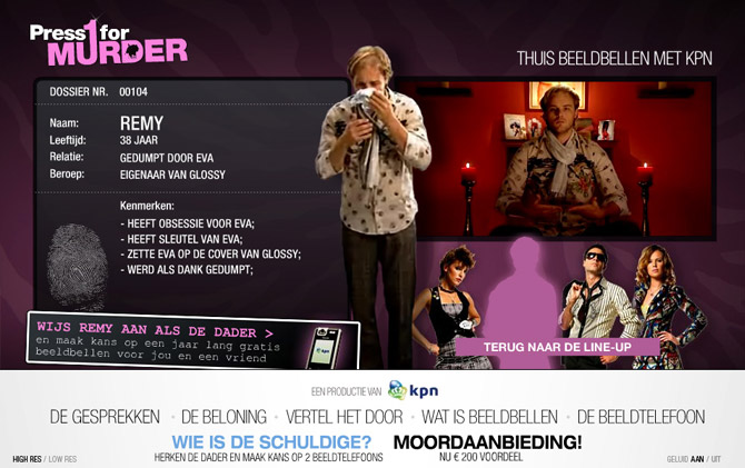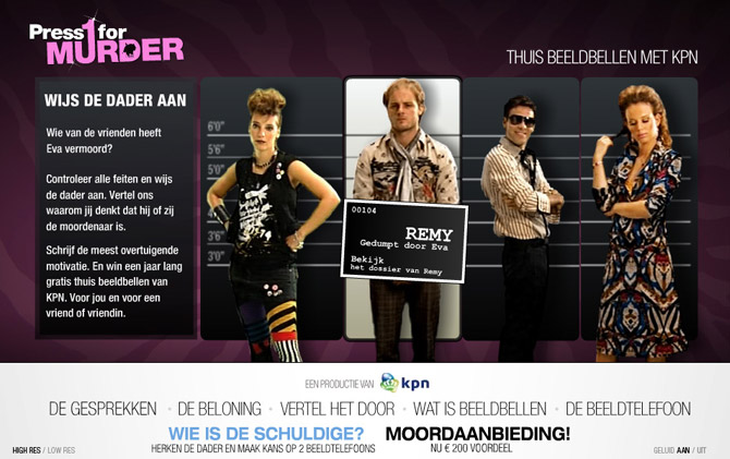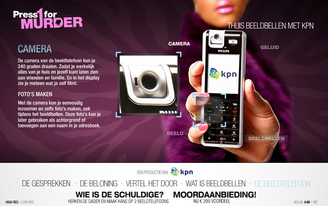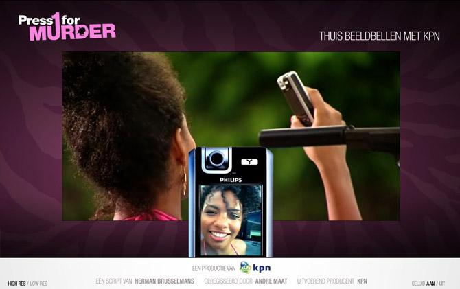 At Qi we made this interactive movie for the introduction of a new service at KPN called 'beeldbellen' (videophone). The challenge was to find the murderer of a young model by watching different scene's from different angles and to video conference with the four suspects.
