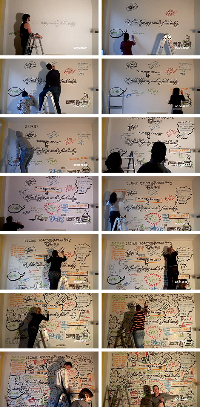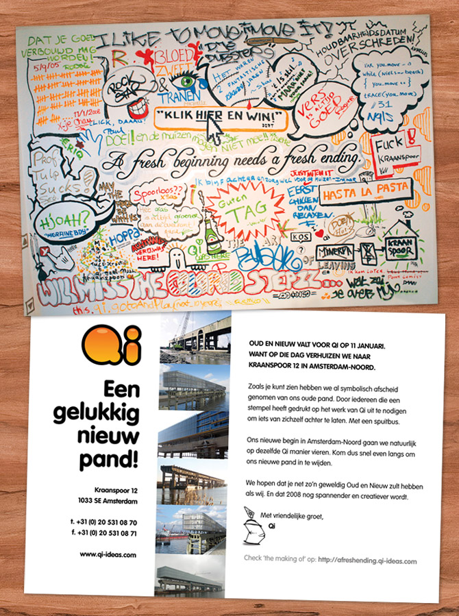 When Qi changed office we made this short video (over period of 4 days) about how we all said goodbye to the old building. The result (a video and a wall cluttered with goodbye messages) was send to clients and friends as an invention for a house warming party of the new office.