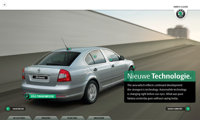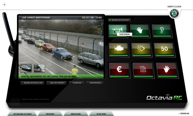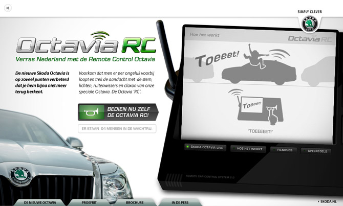 For the introduction of the new Skoda Octavia we at Achtung created an interactive car which you could control while sitting behind your computer. You could honk the horn, flash the lights, whipe the window whipers and let the car speak. Nobody could pass by this new Skoda without noticing it.